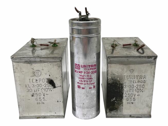 Kondensatory Unitra Telpod 3 szt • KL-3-30-250 30μ +/- 10% 250V 1978 • KL-3-30-250 30μ +/- 10% 250V 1976 • KL-MP ...