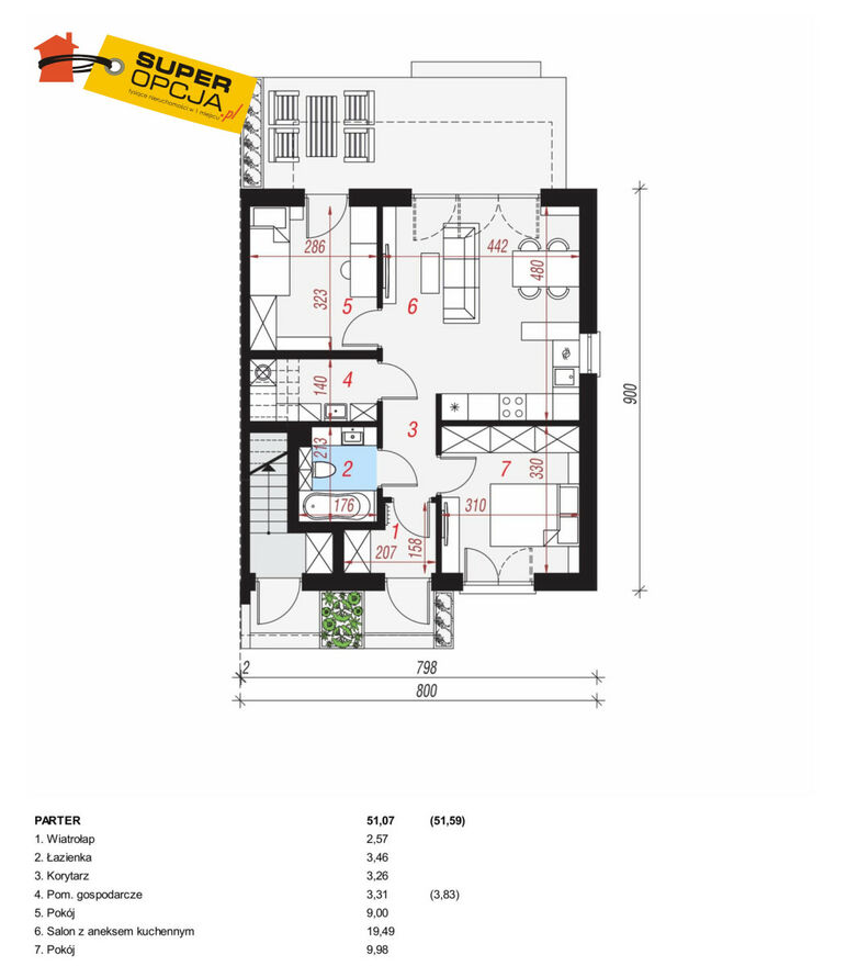 - Pomieszczenie gospodarcze (rzadkość w mieszkaniach tego typu!),
