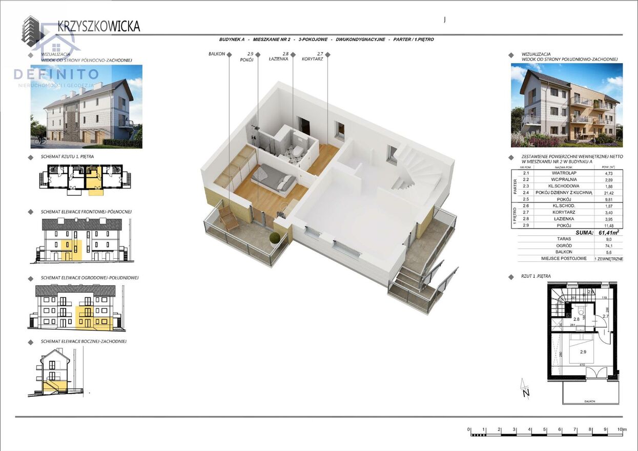 Na sprzedaż: mieszkanie dwupoziomowe | 61,41 m | 3 pokoje | ogród + taras + balkonNa sprzedaż funkcjonalne, dwupoziomowe mieszkanie 3-pokojowe o powierzchni 61,41 m, zlokalizowane w kameralnym budynku mieszkalnym. Nieruchomość wyróżnia się czytelnym podziałem funkcjonalnym, prywatnym ogrodem oraz dodatkowymi przestrzeniami zewnętrznymi.