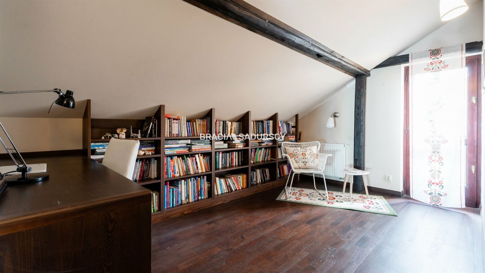 Na poddaszu - znajdują się dwie sypialnie, duża garderoba, łazienka oraz biblioteczka połączona z przedpokojem.